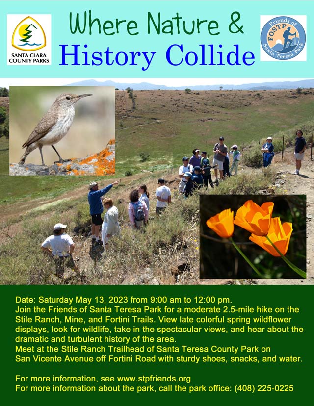 • This is a hike I helped to lead with the Friends of Santa Teresa Park on Saturday May 11, 2019 from 10 am to 1 pm, meeting at the Stile Ranch/Fortini Tralhead on San Vicente Avenue in the Almaden Valley: "Join the Friends of Santa Teresa Park for a moderate 2.5-mile hike on the Stile Ranch, Mine and Fortini Trails. View spectacular wildflower displays, take in the gorgeous views, and learn about the rich history of the area. Meet at the Stile Ranch Trailhead  with sturdy shoes, snacks and water.  Questions? (408) 355-2240​." The Stile Ranch Trailhead is off of McKean Road. Take Fortini Road and turn left on San Vicente Avenue to the parking lot. Here are pictures from the hike.