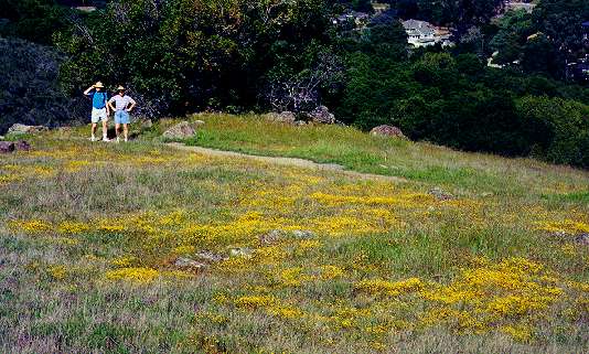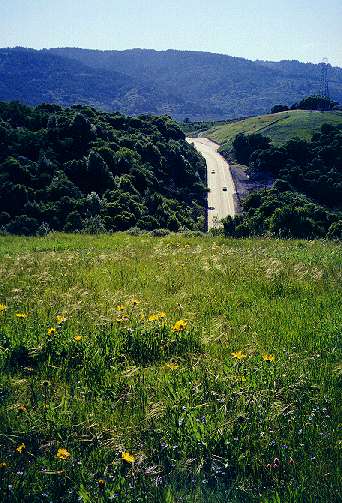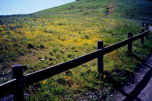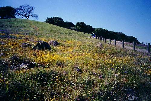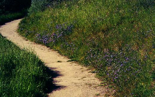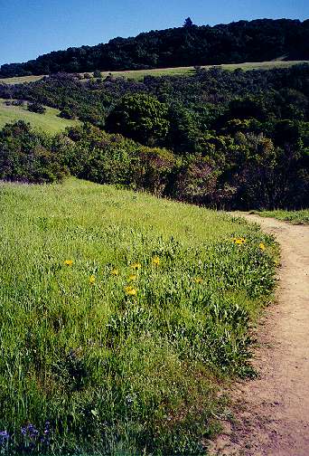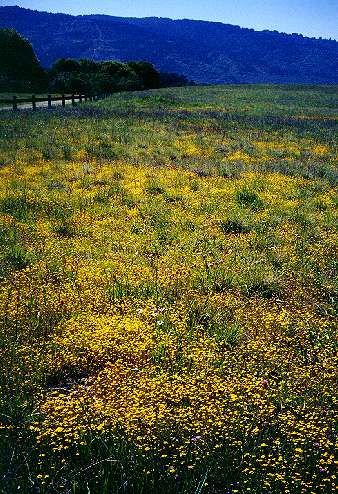 Edgewood County Park and Natural Preserve is a beautiful natural oasis of undeveloped land located in the hills above Redwoood City. It covers 467 acres southeast of the intersection of Interstate 280 and Edgewood Road. It is just east of the Crystal Springs Watershed and the Filoli Mansion and south of Pulgas Ridge Open Space Preserve. It is on hilly land whose elevation ranges from 240 to 873 fet above sea level. It has a wide variety of habitats, including cool, shady forests, steep chaparral-covered hillsides, oak woodlands, and grassy meadows. It has a wide variety of plant and animal species, including 4 protected endangered species. It is a popular place for hiking, horseback riding, picnicking, and nature study year round, but it is most famous for its spectacular display of springtime wildflowers. I took the following pictures on 3/31/2001. Starting at the Old Stage Trailhead, I walked up the switchbacks of the Edgewood Trail through shady oak forests and small grassy meadows. I took a left at the Franciscan Trail, then went up the service road through a broad, sunny meadow covered with wildflowers, with views of the surrounding hills. I turned left at the Serpentine Loop Trail, following it along the base of the ridge. At the intersection with the Ridgeview Trail, I took the Ridgeview Loop Trail up to the top of the ridge. From there, peering through the dense chaparral, I could see the wildflower-covered meadow next to busy I-280 and the Crystal Springs Valley. After dropping down off the ridge and passing the start of the lower half of the Ridgeview Loop Trail, I went up on the short Inspiration Heights Trail, which offered spectacular views of the hills and the Bay. This is a dead end spur, so I backtracked down to the Ridgeview Loop Trail and took the fork down to the right. The goldfields formed an almost solid golden yellow carpet on the lower meadow at the base of the hill. Near the Sunset Trail Head, the Ridgeview, Serpentine, and Clarkia Trail come together. I took the Clarkia Trail, which started out by running down a hot, narrow chaparral-covered canyon. It then ran by meadows and hillsides alive with butterflies, some of which may have been the endangered checkerspot. The Clarkia Trail ends at a Canada Road. Not wanting to exit there, I backtracked to the Sunset Trail Head and took the southern leg of the Serpentine Loop. This trail ran below the park's ridge, with views of the slopes below the ridge and flower-covered meadows to the west near I-280. I continued on to take the Edgewood Trail along the northwest edge of the park. The trail offered views of canyons and adjacent hills. At the next junction, I took the Franciscan Trail to the northern side of the Sylvan Trail. The Sylvan Trail zigzagged down the hillside through shady forests. (Note: I'm not a botanist, so I could use help in identifying some of these flowers.)