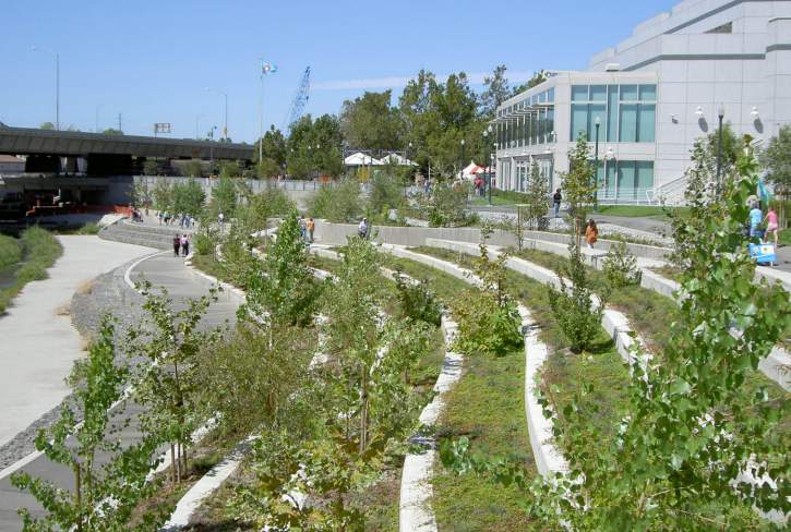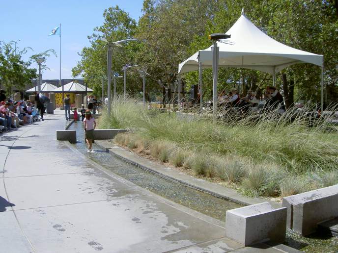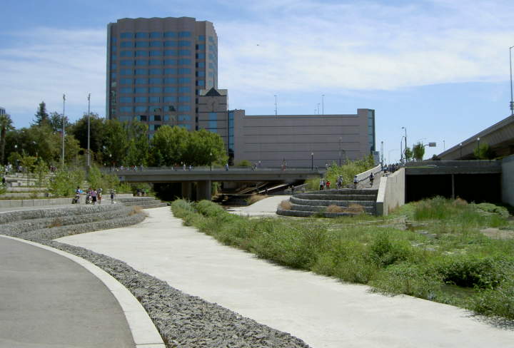 of the river looking south from the Woz Way Bridge. Ramps and stairs