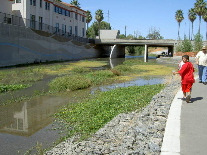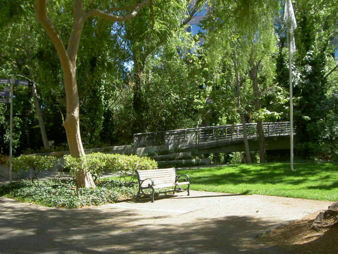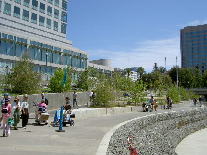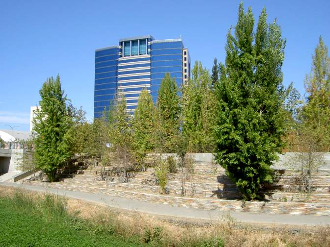 These terraces are on the east side of the river below the Adobe building. Ahead in the background is McEnery Park. McEnery