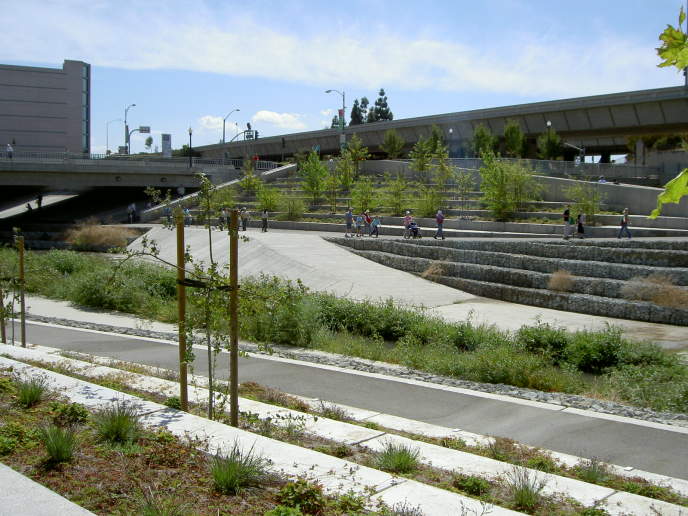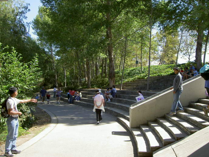 under-crossing. Ramps and stairs lead down the trail. Terraces line the