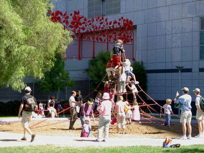 park has this pyramidal rope climbing structure. In the background is