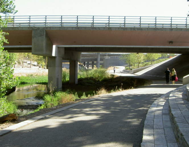 The trail runs under Hwy 87 here. This is the ramp leading up to Park Avenue. This is a view looking south down the riverbed towards the Park Avenue bridge. Looking