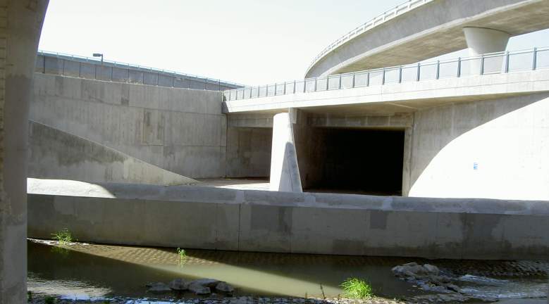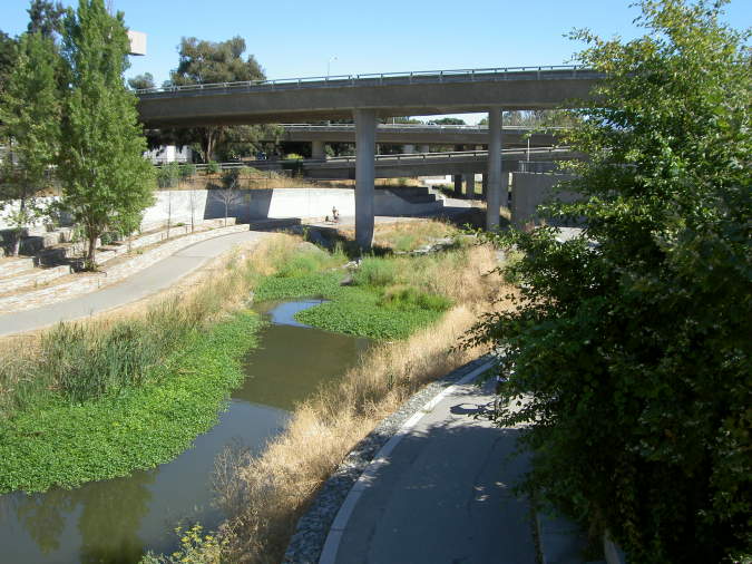This is the Santa Clara Street under-crossing on the east bank of the river. The trail runs along the river and close to it below Hwy 87. This