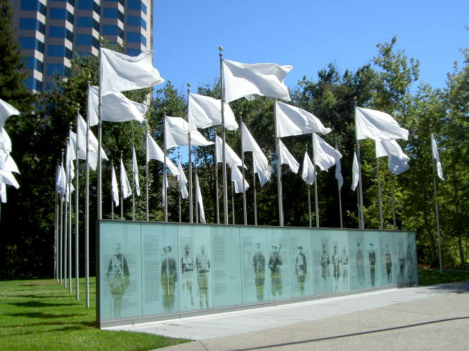 Memorial. This consists of 76 white flags and glass panels inscribed
