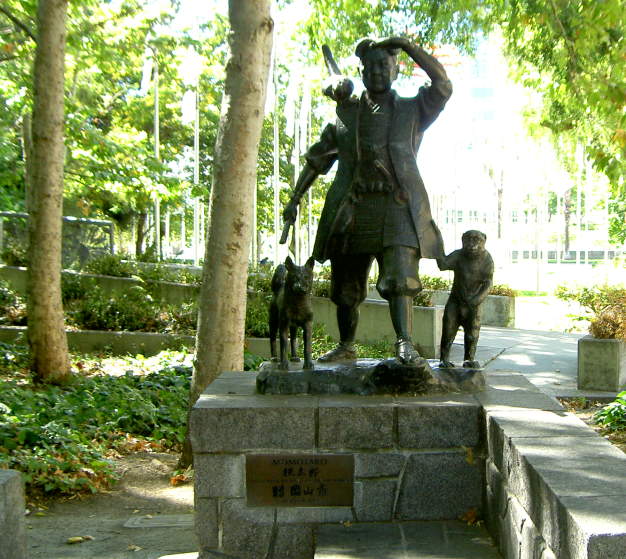 This is the Okayama, Japan Sister City sculpture, illustrating the Japanese tale of Momotaro, the Peach Boy. South of the Veterans Memorial is a pedestrian bridge over the river. This is the trail on the west side of the river, with the pedestrian bridge overhead. The west bank