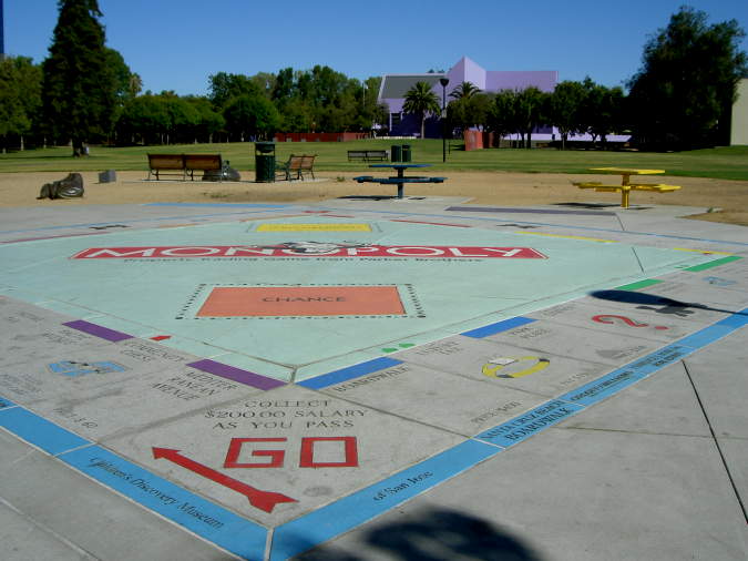Monopoly in the Park game. Across the lawn is the Children's Discovery Museum.