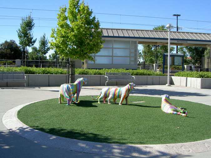 Light Rail station. In front are three painted lions in a sculpture
