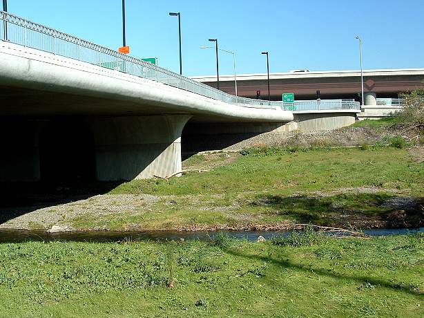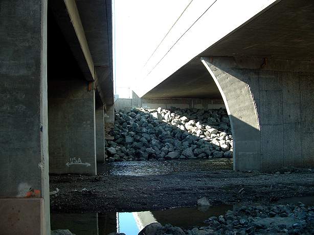 This a view looking south down the east bank trail, next to the rental car parking lot. The trail goes under the rental car parking lot bridge, running close to the river. A short distance beyond is the Hwy 101 undercrossing. Looking across to the west bank, there are only rocks, no trail. The trail rises up to on a long ramp to the top of the levee on the north side of 101. Looking back at the Hwy 101 undercrossing. Looking