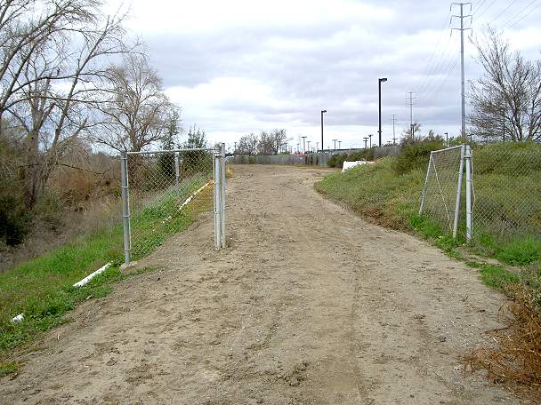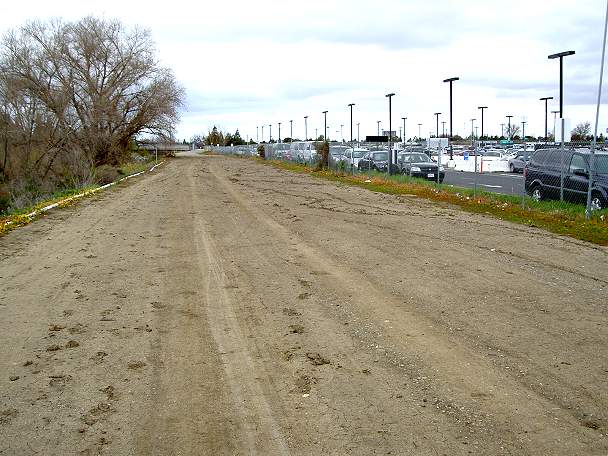 On the other side of the river is the airport's terminal A short-term parking lot. The trail continues through a gate as it approaches the rental car parking lot. The