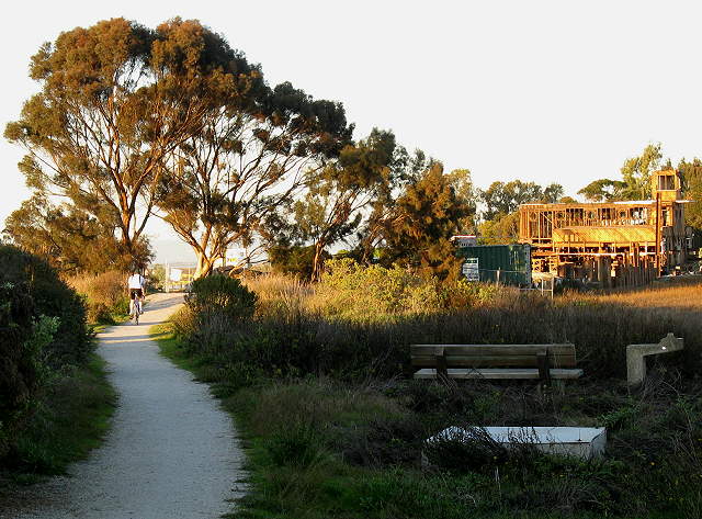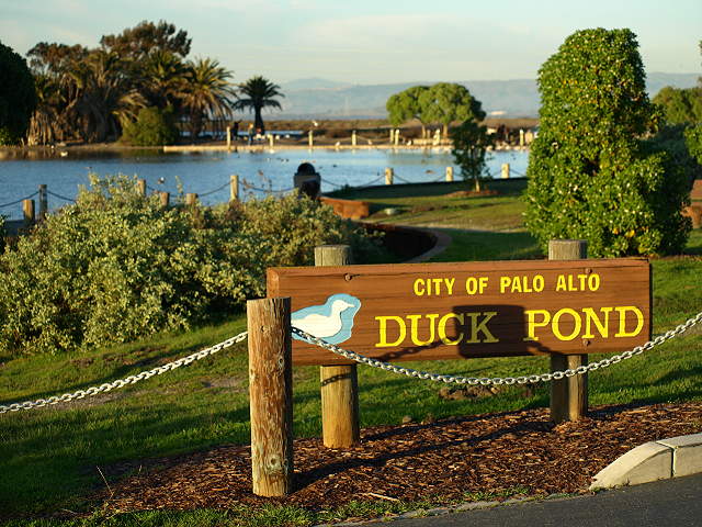 Byxbee Park pole field, the paths are covered with crushed oyster shells, 11/23/02 View of the former Palo Alto Yacht Harbor from the Byxbee Park hills, 11/23/02 View from the Byxbee Park hills of the chevrons, made of concrete road barriers, pointing to the Palo Alto Airport runway, 11/23/02 Path on top of the Byxbee Park hills through low retaining walls, called the Alluvial Fans, 11/23/02 Hillocks on top of the Byxbee Park hills, inspired by Indian shell mounds, 11/23/02 "Wind Wave Piece" sculpture on top of the Byxbee Park hills, 11/23/02 View of Mayfield Slough from the top of the Byxbee Park hills, 11/23/02 Trail below the Byxbee Park hills, 5/18/03 The Palo Alto Yacht Harbor Basin at high tide, with the former Sea Scouts building in the background, 6/10/07 The Harbor Basin at low tide, with the Byxbee Park chevrons on the hill, 2/7/09 The Marsh Front Trail with interpretive signs along the edge of the Yacht Harbor Basin, with the water treatment plant in the backround, 2/7/09 This is what the Marsh Front Trail and the Sea Scouts building looked like on 9/3/07 Trail leading past the former Sea Scouts building, now being renovated, 2/7/09 The old Sea Scouts building is being converted into an environmental education center, scheduled for 2009, 2/7/09 The Palo Alto Duck Pond, 2/7/09 The Duck Pond, 5/27/07 The Duck Pond, 11/23/02 The Duck Pond, with the old Sea Scouts building in the background, 9/03/07 The north side of the Palo Alto Yacht Harbor Basin, 5/18/03 Painters along the Yacht Harbor Basin at low tide, 2/7/09 Sculpture in parking lot by the