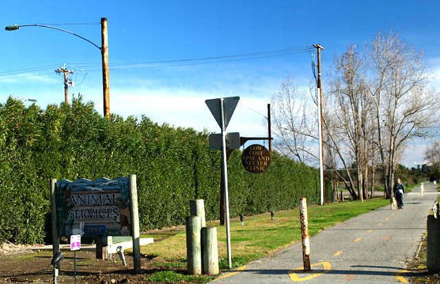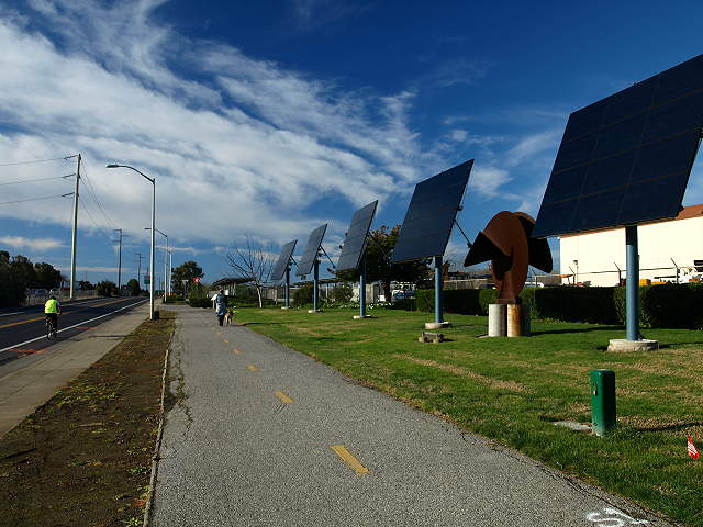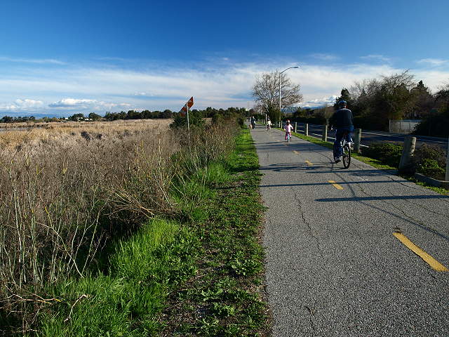 The Adobe Creek Loop Trail between the Emily Renzel Wetlands (left) and Matadero Creek (right), 2/7/09. East of here, the paved Bay Trail becomes part of the Adobe Creek Loop Trail. The Bay Trail crosses over Matadero Creek on this bridge, 7/21/02 Looking north: East Bayshore Road, the Bay Trail, solar panels, and sculpture by the Palo Alto Municipal Service Center, 2/7/09 South of the service yard, the trail runs past the Palo Alto Animal Services Center, 2/7/09 The Bay Trail passing by the North Flood Control Basin, 2/7/09 A spur trail runs through the