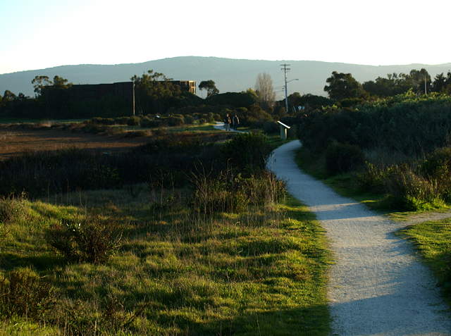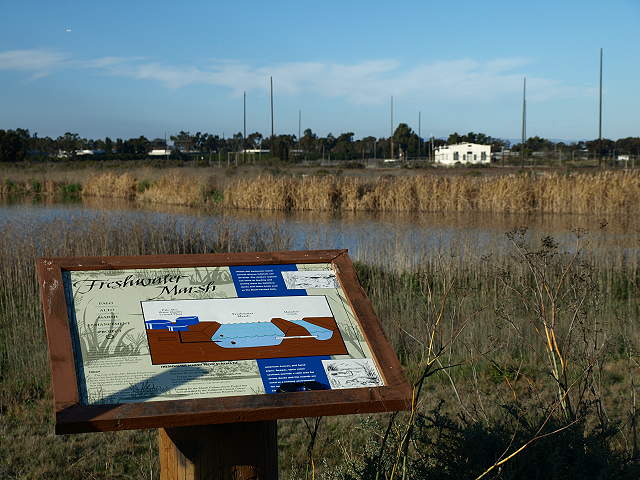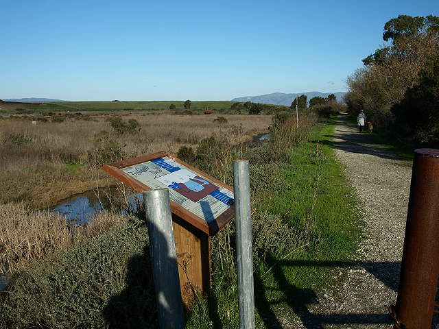 Sign by the Emily Renzel Wetlands along the Bay Trail, 2/7/09 The Renzel Trail, part of the Bay Trail, along the Emily Renzel Marsh, 2/7/09 The marsh interpretive sign, explaining the water drainage in the marsh, with the old radio station in the background, 2/7/09 Past here, the paved Bay Trail is