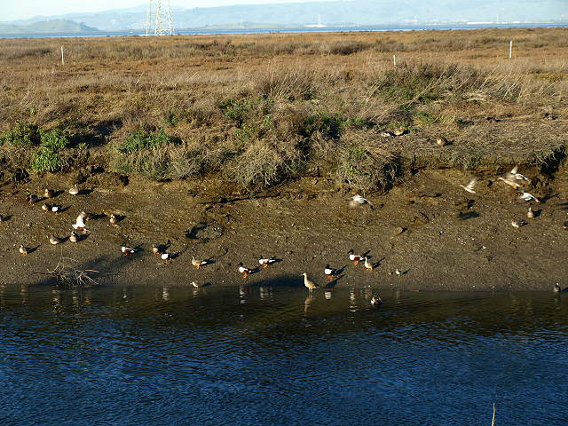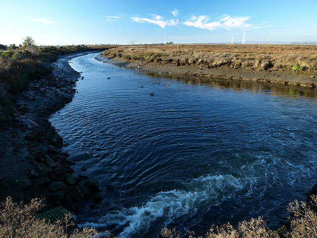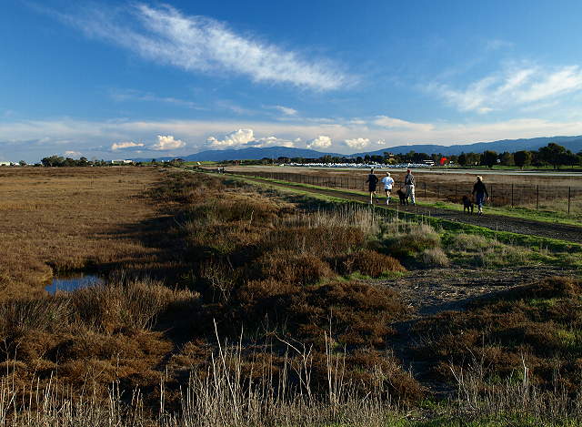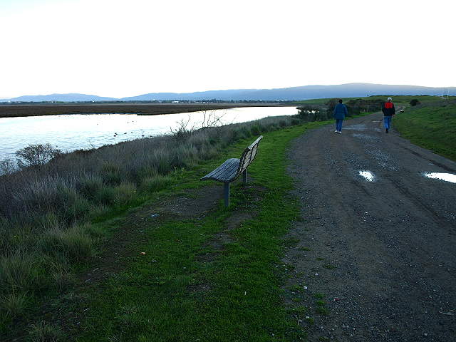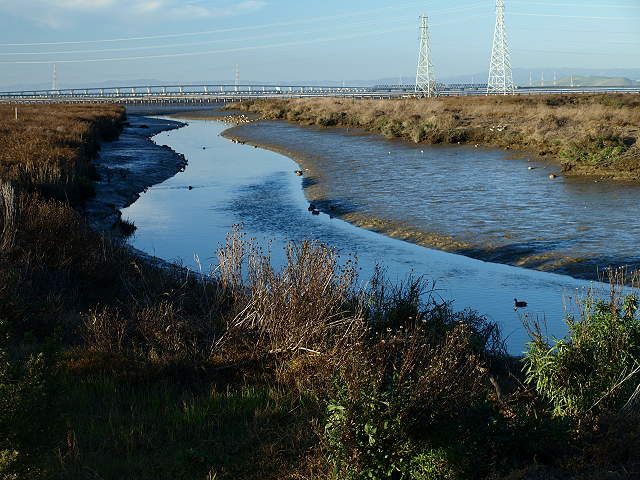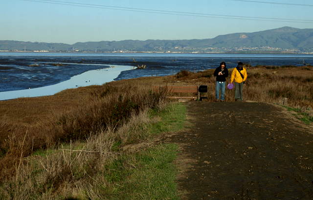 The trail begins along the levee between Adobe Creek in the Palo Alto Baylands and Charleston Slough in Shoreline at Mountain View Park. The start of the Baylands trail at the west end of Shoreline Park, 2/7/09 Pelicans in the wetlands of Adobe Creek, with the South Flood Control Basin in the background, 7/21/02 Pelicans in the Adobe Creek wetlands, 7/21/02 Pelicans in Adobe Creek, with Byxbee Park and the landfill hills in the background 7/21/02 Birds in Adobe Creek, with the Byxbee Park hills and the Dumbarton Bridge in the background, 2/1/09. Egret in Adobe Creek, with the Dumbarton Bridge in the background, 2/1/09. Hikers on the Adobe Creek Loop Trail by the Adobe Creek Flood Control Basin, 2/1/09 The Baylands Trail reaches San Francisco Bay, 2/1/09 Birds on a catwalk on the Bay, 2/1/09. Sunset on the channel by Hooks Island 6/10/07 Tidal Dam on the Flood Control Basin, 6/10/07 Looking towards the mouth of the Palo Alto Yacht Harbor and the Sailing Station from near the dam, 9/3/07. Sunset over the former Palo Alto Yacht Harbor, now a restored marsh, 6/10/07 The trail reaches the hills of