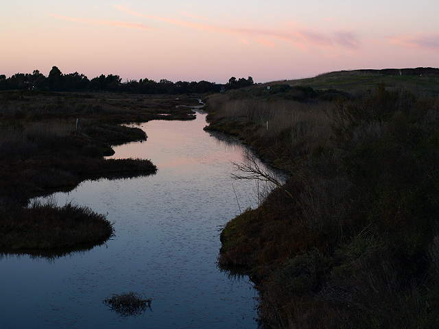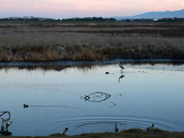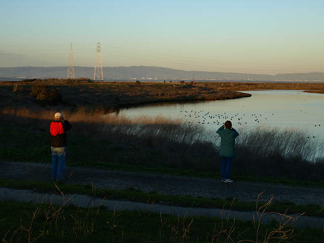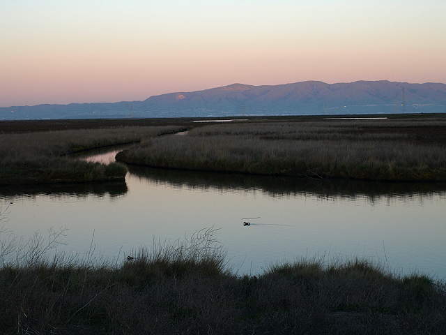 The Adobe Creek Loop Trail returning to Shoreline Park, 2/7/09 An alternate route back is to take the Adobe Creek Loop Trail along Mayfield Slough and Matadero Creek starting at the Byxbee Park Pole Field: Birdwatchers and Mayfield Slough, 2/7/09 On the trail along Mayfield Slough, with Byxbee Park on the right, 2/7/09 Overlooking Mayfield Slough at sunset, 2/7/09 Great egret on Mayfield Slough, 2/7/09 Channel in the Renzel wetlands at sunset, 2/7/09 The trail continues along Matadero Creek and intersects the paved Bay Trail along East Bayshore Road, leading back to Shoreline Park. |